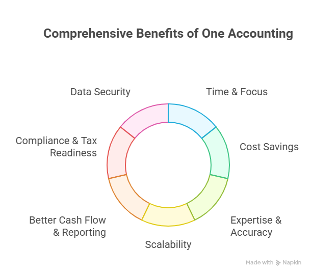 - Time & Focus: Spend less time on spreadsheets and more time running your business. With One Accounting managing your books, you’ll finally have space to grow, market, and strategize.
